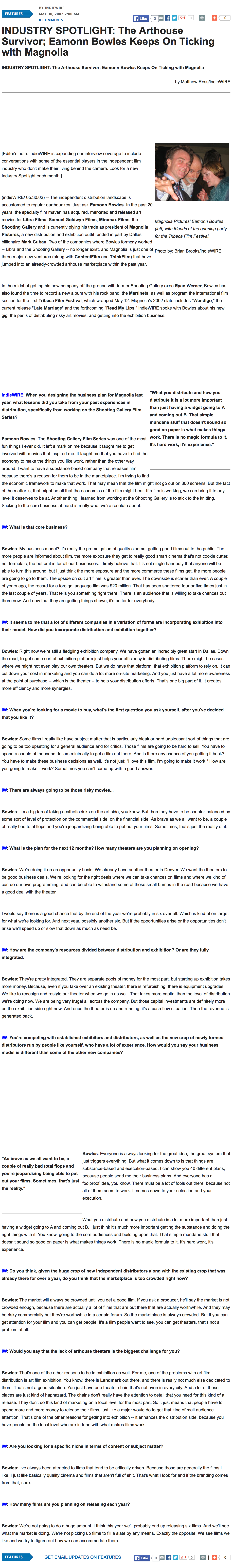 A collection of my monthly "Industry Spotlight" column for Indiewire, the leading independent film site on the Web. Written while I was also the site's senior editor in 2002-3.