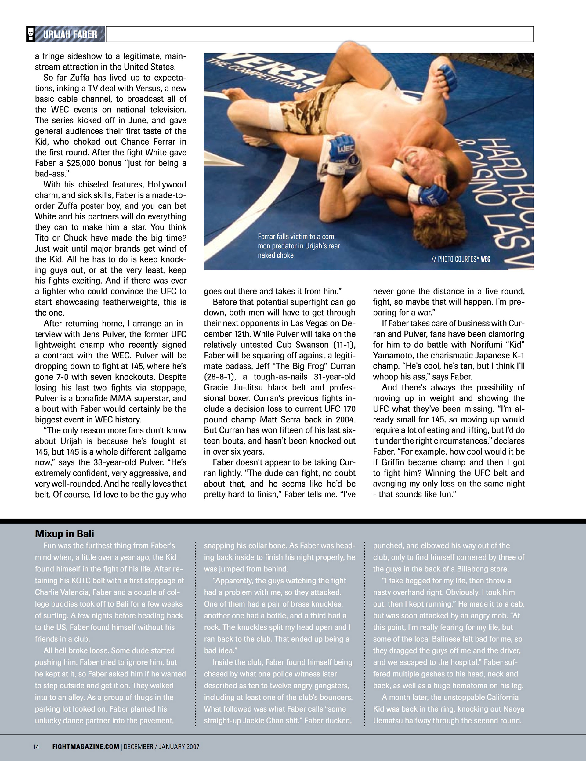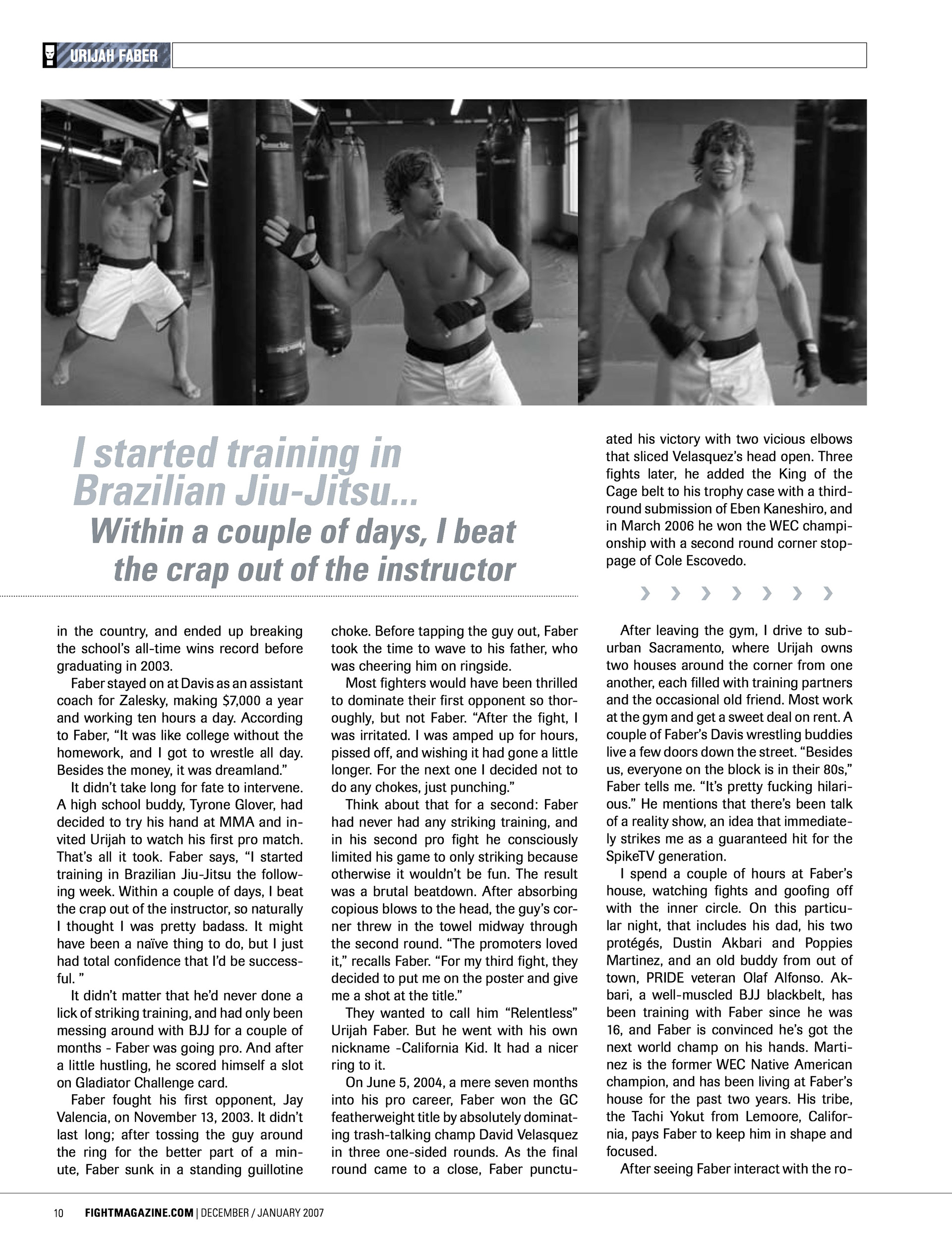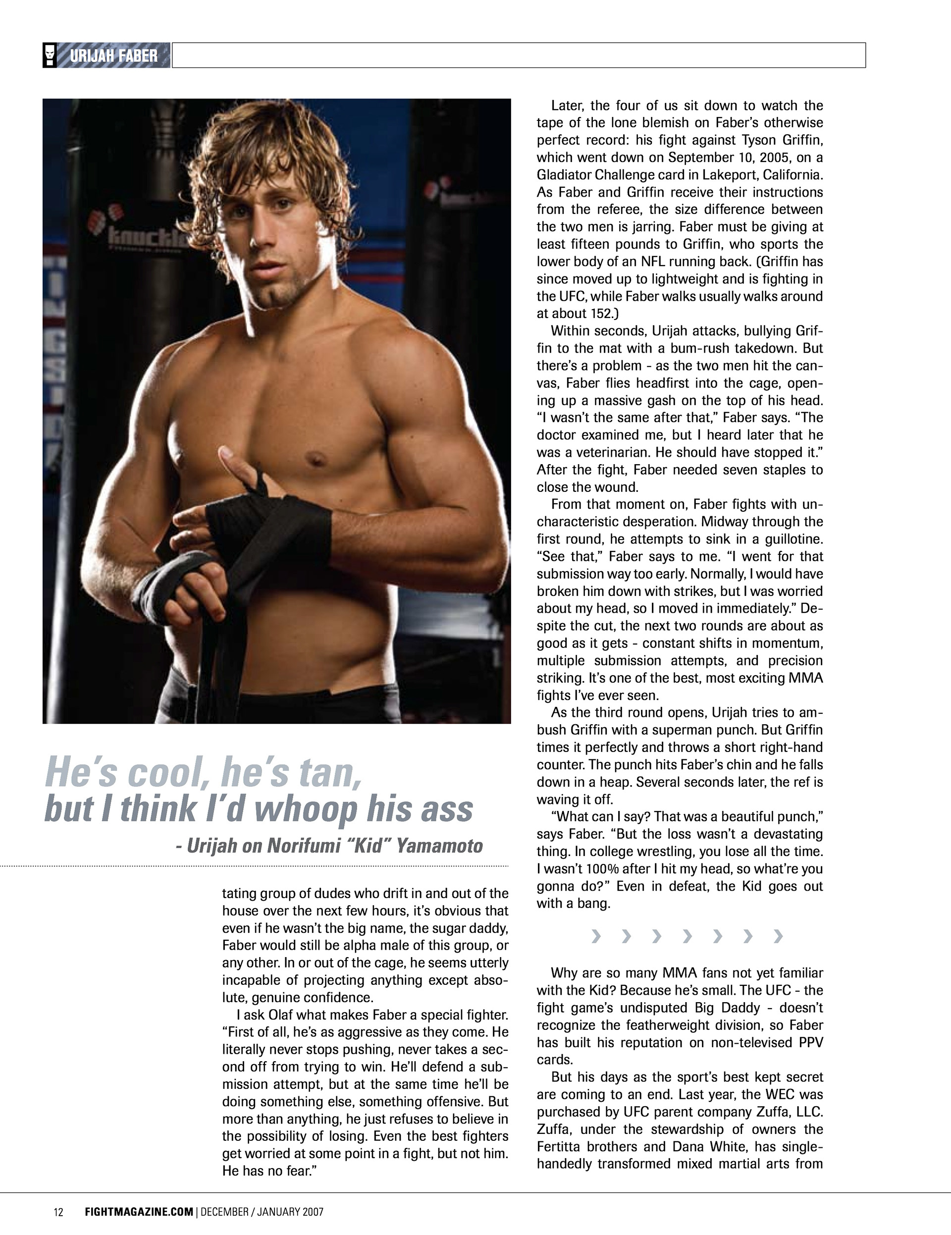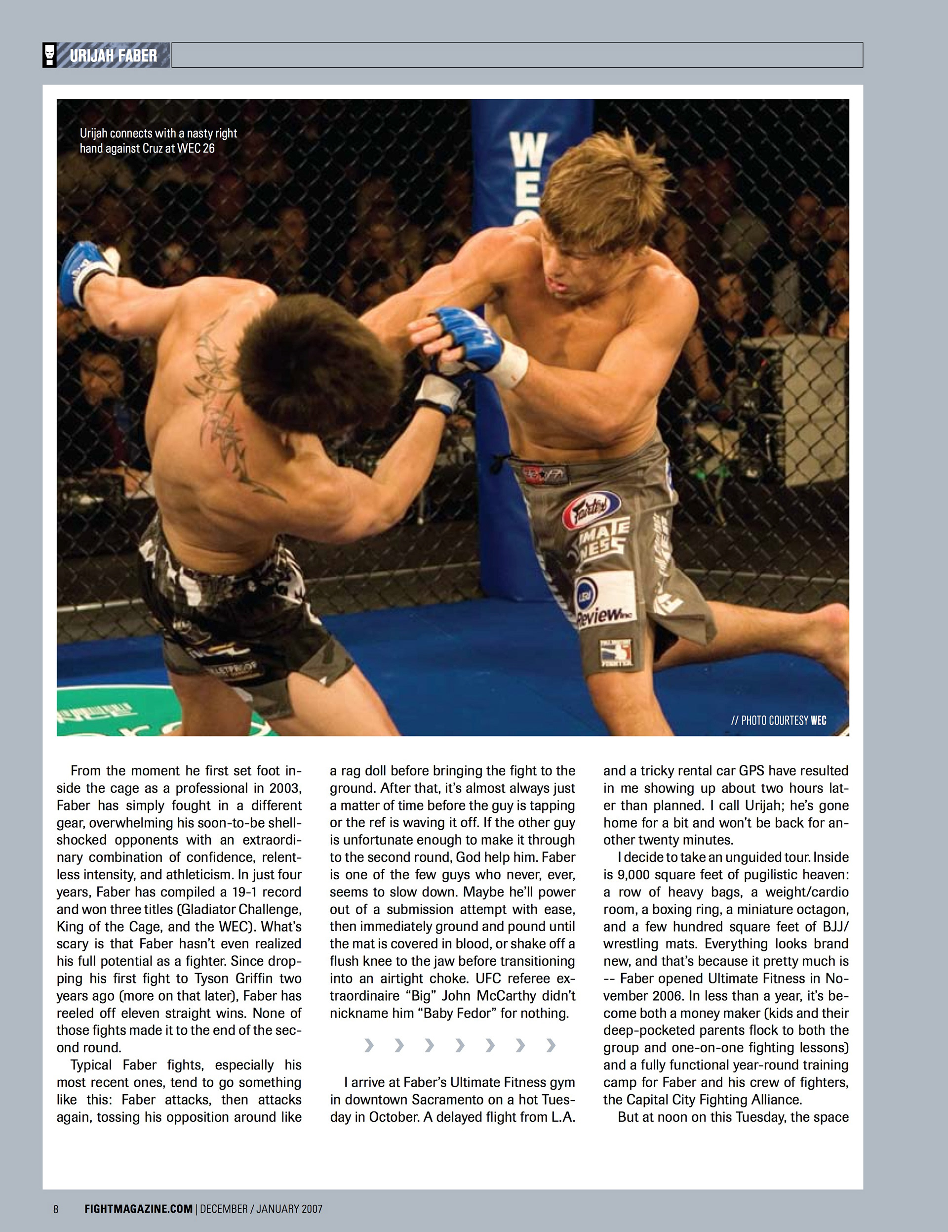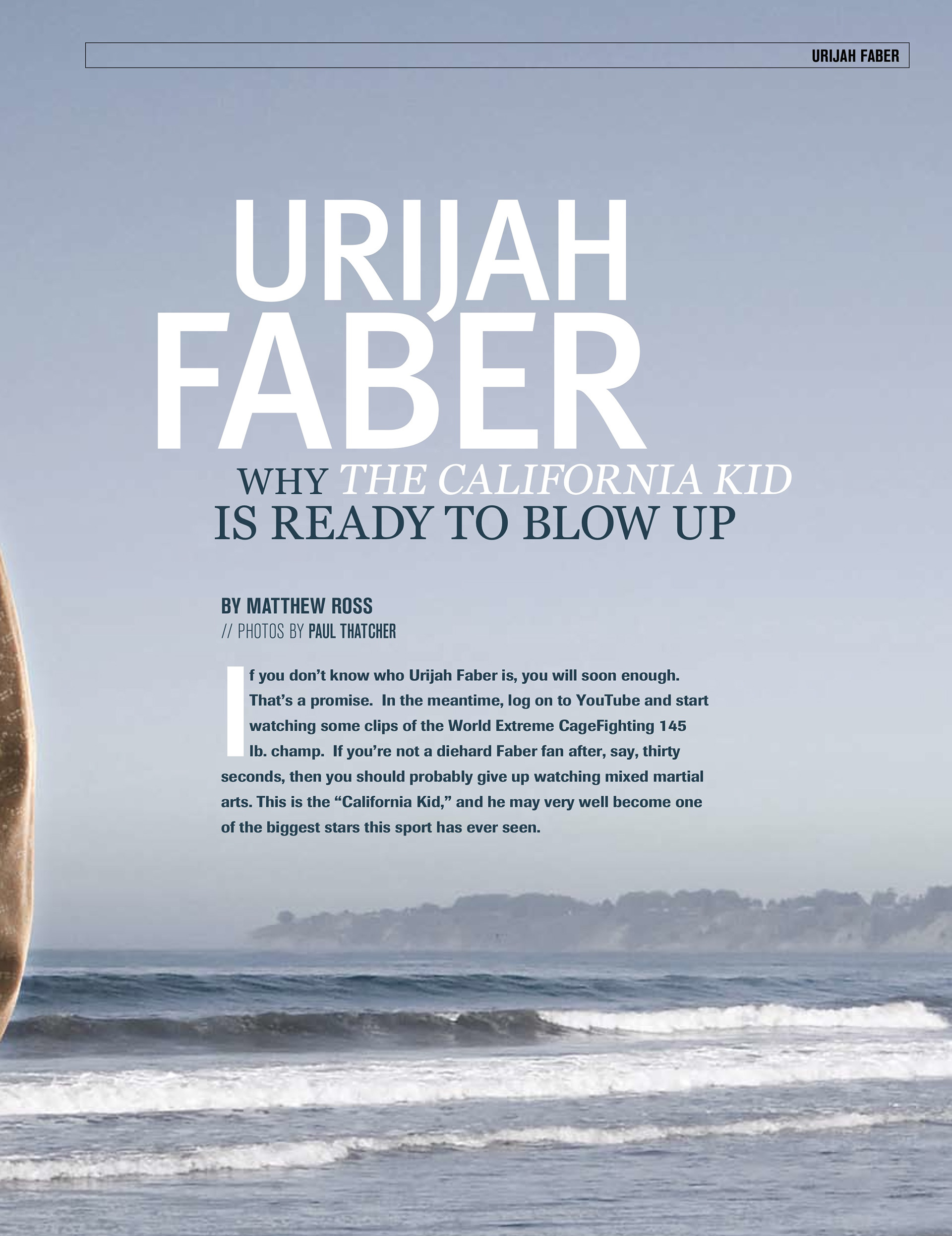 Cover story I wrote on WEC champion Urijah Faber for FIGHT!, the most widely circulated mixed martial arts magazine in the U.S. 3500+ words.